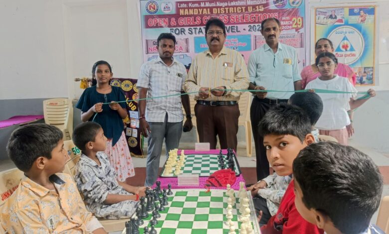 నంద్యాల పల్లెవాణి: నంద్యాల జిల్లా చెస్ సంఘం ఆధ్వర్యంలో,ఎన్.ఆర్.జి. చెస్ అకాడమీ గౌరవ చైర్మన్ రాజేష్ సౌజన్యంతో ఆదివారం స్థానిక ఈపూరి శేషయ్య శెట్టి ప్రభుత్వ పాలిటెక్నిక్ కళాశాల జింకా ఆడిటోరియంలో 15 సంవత్సరాలలోపు బాల బాలికలకు వేరువేరుగా జిల్లా స్థాయి ఓపెన్ చెస్ టోర్నమెంట్ పోటీలు ప్రారంభమయ్యాయి. ఈ సందర్భంగా జిల్లా చెస్ సంఘం ప్రధాన కార్యదర్శి రామసుబ్బారెడ్డి నిర్వహణలో జరిగిన ప్రారంభోత్సవం కార్యక్రమంలో నంద్యాల జిల్లా చెస్ సంఘం అధ్యక్షులు డాక్టర్ రవికృష్ణ రిబ్బన్ కత్తిరించి టోర్నమెంట్ ను లాంచనంగా ప్రారంభించారు.